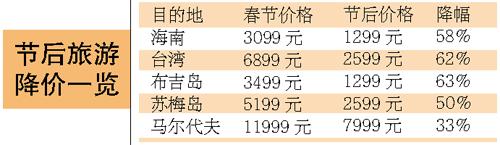 一路飆漲的旅游價(jià)格終于從今天開始大幅跳水。來自各大旅行社的報(bào)價(jià)顯示,與春節(jié)黃金周相比,即日起節(jié)后整體旅游價(jià)格下降三至四成,最高降幅超過六成。其中降幅最大的是春節(jié)期間漲至萬余元的三亞酒店房價(jià),節(jié)后跳水將近八成。