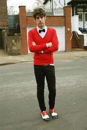 著裝智慧:①紅色拼接牛津鞋與紅色針織衫的呼應。②黑色小領結(jié)的運用。
