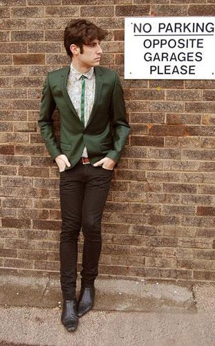 1.復古碎花襯衫 Vintage Shop 2.墨綠西服外套 topman 3.綠色絲帶 DIY 4.黑色瘦腿褲子 topman