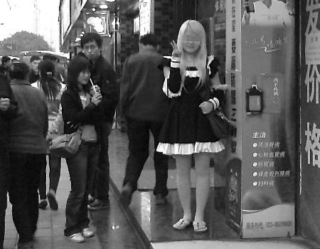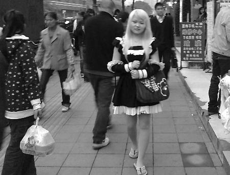 在人潮如織的大街上,一位身穿黑色女仆裝的金發(fā)女孩,正悠然自得地閑逛著——這仿佛日本動畫片中的場景,前日下午,竟在大坪正街上演。原來,這位17歲的女孩,是一位地道的日系“動漫族”,有時(shí)候是女巫裝,有時(shí)則是人型電腦裝,幾乎每天她都會按照日本動漫角色的穿著出門。