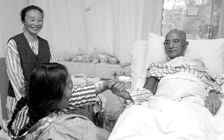 昨日下午3時11分,省醫(yī)院ICU。醫(yī)護人員聽說代吉卓瑪專門來看望丈夫昂文根德時,趕緊幫忙打開ICU的玻璃門。根德聽說妻子從華西醫(yī)院過來看他,坐在病床上急切地向門口張望!艾F(xiàn)在感覺怎么樣?好多了吧?”輪椅上的卓瑪來到病床邊,緊緊地抓住丈夫的手輕聲問道。看到多日未見的妻子,根德黝黑的臉上笑容燦爛。指指自己的喉嚨,豎起大拇指,又拼命地點頭。因為剛剛做過手術(shù),根德尚不能說話,他只能通過肢體語言告訴妻子,他很好。