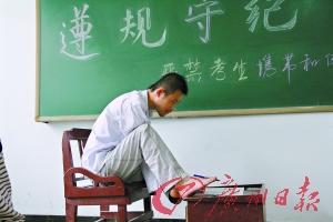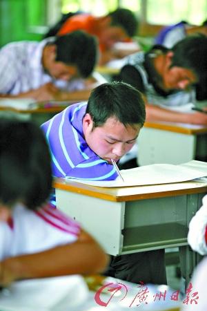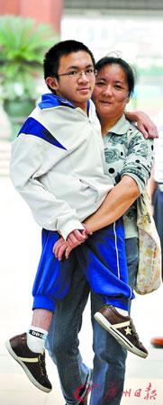 就讀于廣州市越秀外國(guó)語(yǔ)學(xué)校的高三男生勇仔(化名)的趕考路異于他人:媽媽推著輪椅,將他送到廣州市第三中學(xué)考場(chǎng),接下來就由監(jiān)考老師接手。勇仔的試室在4樓,兩個(gè)壯年男老師一左一右抬起輪椅,將他護(hù)送到座位上。由于從出世以來就身患“成骨不全”,勇仔無法靠雙腿行走。從小學(xué)5年級(jí)至今,他能有機(jī)會(huì)參加高考,可以說全賴媽媽龔女士的懷抱。