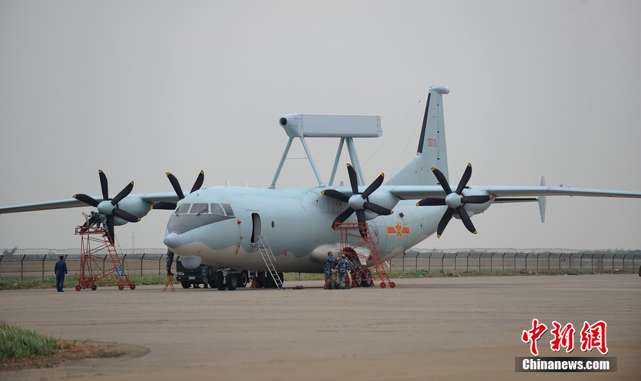 空警-200機載雷達天線類似體操用的平衡木,是中國自行研制的一種輕型、全天候空中型預警飛機,在運8C型機基礎上進行了80%以上改動而成。曾在2009年國慶閱兵中現(xiàn)身。陳海峰 攝