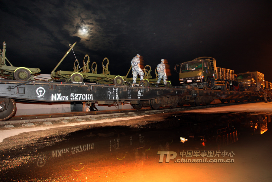 空軍戰(zhàn)斗群地轉(zhuǎn)人員,在黑水火車站冒雨進(jìn)行裝備重組,并對其備進(jìn)行加固。 曹占禮 攝