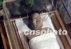 中國(guó)長(zhǎng)沙馬王堆國(guó)寶級(jí)文物——著名的西漢辛追貴夫人的遺體,十六日凌晨?jī)牲c(diǎn)成功搬入長(zhǎng)沙博物館“新居”,既新建的現(xiàn)代化陳列館展覽地宮里。專(zhuān)家為貴夫人換了一個(gè)新的水晶玻璃棺,并灌注新的保護(hù)液。辛追夫人遺體在地下埋藏了兩千多年后,又經(jīng)過(guò)三十年的保存和展覽,仍然完好無(wú)損。作者:中新社
