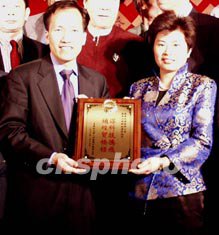 由中國國務(wù)院僑辦經(jīng)濟(jì)科技司司長吳洪芹(右)率領(lǐng)的中國經(jīng)濟(jì)科技考察團(tuán),一月十五日抵美后即前往紐約華埠,向紐約僑胞拜年。紐約華人社團(tuán)聯(lián)合總會主席梁冠軍(左)代表紐約僑界向代表團(tuán)贈送了“鋪經(jīng)貿(mào)橋梁、謀科技騰飛”的牌匾。作者:趙海燕