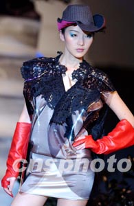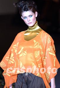 1月17日在香港時(shí)裝節(jié)舉辦的“香港青年時(shí)裝設(shè)計(jì)家創(chuàng)作表演賽2003”上,模特展示青年時(shí)裝設(shè)計(jì)師才華橫溢的時(shí)裝作品。中新社傳真 洪少葵 攝