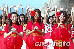 春節(jié)臨近,中國著名模特杜鵑、賈妮妮、包玉蘭(從左至右)手持大紅燈籠,與二百模特佳麗做秀海南三亞天涯海角,參加“三亞與美麗同行活動”,營造節(jié)日喜慶氣氛,迎接即將到來的中國農(nóng)歷羊年。作者:毛建軍
