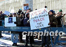 一月二十七日聯(lián)合國武器監(jiān)測、核查和視察委員會主席布利克斯和國際原子能機構(gòu)總干事巴拉迪向安理會提交對伊武器核查報告,與此同時,聯(lián)合國大樓外近百名反戰(zhàn)人士舉著反戰(zhàn)標(biāo)語高喊“不要戰(zhàn)爭”,反對美國對伊開戰(zhàn)。作者:趙海燕
