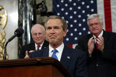 在當(dāng)?shù)貢r(shí)間周二晚間發(fā)表的國情咨文中,布什表示:“有人說在危機(jī)來臨的時(shí)候,我們再作出反擊。難道等恐怖主義分子和暴君表明了他們的意圖后,我們再關(guān)注他們的進(jìn)攻嗎?如果威脅突然出現(xiàn),那么所有的行動,所有的話,所有的自責(zé),都已為時(shí)已晚。”他表示,“相信薩達(dá)姆心智健全,認(rèn)為他會容忍克制的想法是不合適的!