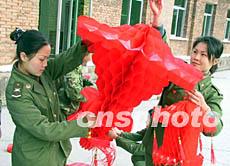 三十日,駐閩某部文藝連營房處處張燈結彩,一派春意盎然的景象,喜迎羊年新春。圖為今年首次在軍營歡度春節(jié)的女兵將大紅燈籠高高掛起。作者:劉可耕