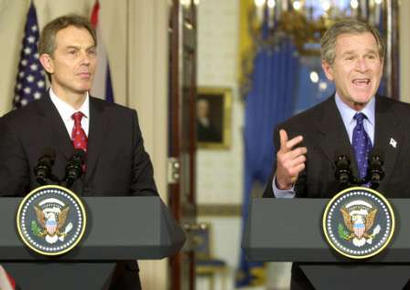布什在會(huì)談結(jié)束后與布萊爾聯(lián)合舉行的記者招待會(huì)上說,國務(wù)卿鮑威爾下周將向聯(lián)合國安理會(huì)出示證據(jù),證明“薩達(dá)姆正在愚弄世界”。他說,伊拉克問題“將在幾個(gè)星期,而不是幾個(gè)月內(nèi)得到解決”,美國堅(jiān)決反對(duì)任何將伊拉克問題拖延幾個(gè)月后再解決的企圖。
