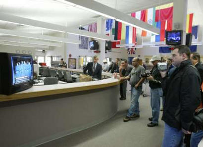 2月1日,記者們(右)在肯尼迪航天中心的新聞中心收聽有關(guān)航天飛機(jī)的最新消息