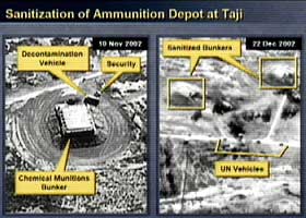 他說,伊拉克在核查員抵達(dá)前轉(zhuǎn)移了可疑的生化武器設(shè)備。他所提交的人造衛(wèi)星拍攝的照片,顯示伊拉克擁有“違禁材料”,他還播放電話錄音,顯示伊拉克軍官要求銷毀證據(jù)的對話和做假證以及關(guān)于毒氣的內(nèi)容。