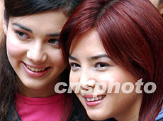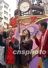 香港歌手李蘢怡、和“明珠大使”保采芬,二月九日出席在銅鑼灣時(shí)代廣場(chǎng)舉行的情人節(jié)“戀人短訊”大募集活動(dòng)。錢興強(qiáng) 攝