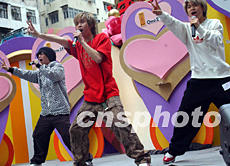 香港音樂組合E-KIDS二月九日在銅鑼灣時(shí)代廣場(chǎng)舉行的情人節(jié)“戀人短訊”大募集活動(dòng)上助興演唱,吸引眾多歌迷。