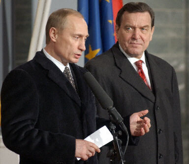 普京與施羅德在會談結(jié)束后召開聯(lián)合記者招待會