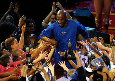 瑪利亞-凱莉介紹喬丹出場(chǎng),喬丹受到了全場(chǎng)球迷的歡呼,全場(chǎng)球迷都起立向他致敬。