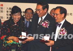 由香港九家媒體聯(lián)合主辦的“2002年特區(qū)政府施政十件大事”評(píng)選頒獎(jiǎng)禮,二月十九日在中央圖書館舉行。圖為香港中聯(lián)辦副主任王鳳超(中)、特區(qū)政務(wù)司司長(zhǎng)曾蔭權(quán)(右)向榮獲一等獎(jiǎng)的投票讀者馮明嬌女士頒獎(jiǎng)。中新社傳真 潘索菲 攝