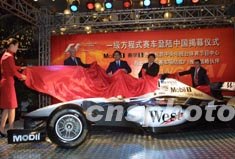 參加2003年世界F1比賽的麥克拉倫·梅賽德斯車(chē)隊(duì)的新型賽車(chē),24日在北京揭幕亮相,隨著2004年世界F1比賽進(jìn)入中國(guó)上海國(guó)際賽車(chē)場(chǎng),國(guó)際各個(gè)大牌車(chē)隊(duì)都將在中國(guó)進(jìn)行展示。作者:趙振清