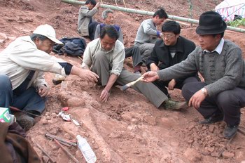 中新網(wǎng)3月2日電 曾經(jīng)出土過許多恐龍蛋化石、骨化石的浙江省天臺縣,最近邀請有“龍王”美譽(yù)的中國科學(xué)院古脊椎古人類研究所著名恐龍專家董枝明教授、中國地質(zhì)科學(xué)院資源所礦物巖石學(xué)家陳克樵教授首次對恐龍骨化石進(jìn)行科學(xué)的搶救性挖掘。經(jīng)過近一周的工作,已發(fā)現(xiàn)了恐龍脊柱骨、肋骨、尾脊、小的甲片、前后肢等化石。
