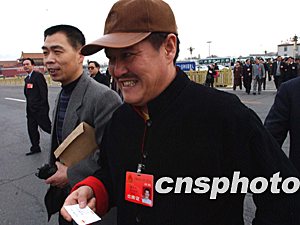 影視明星趙本山三月四日參加全國(guó)人大十屆一次會(huì)議的預(yù)備會(huì)途中,忙于接受代表和新聞界遞來(lái)的名片。作者:賈國(guó)榮