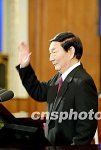 在與會(huì)五千多名人大代表、政協(xié)委員的持久掌聲中,江澤民、胡錦濤、李鵬、朱镕基、李瑞環(huán)、李嵐清、吳邦國(guó)、溫家寶、賈慶林、曾慶紅、黃菊、吳官正、李長(zhǎng)春、羅干等中國(guó)領(lǐng)導(dǎo)人微笑著步入會(huì)場(chǎng)。