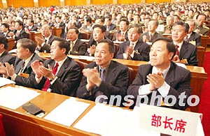 第十屆全國人民代表大會(huì)第一次會(huì)議五日在北京人民大會(huì)堂開幕,列席大會(huì)的部長們鼓掌盛贊朱總理的政府工作報(bào)告。作者:毛建軍