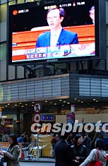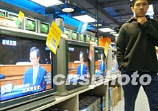 素有購物天堂美譽(yù)的香港,商家關(guān)注稅務(wù)制度改革。三月五日公布的香港2003至2004年度財(cái)政預(yù)算案成為此間商家關(guān)注熱點(diǎn),圖為電器店里的電視機(jī)播出財(cái)政司司長梁錦松提交的預(yù)算報(bào)告。潘索菲 攝