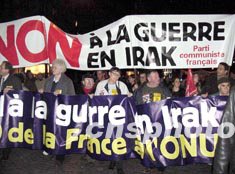 法國巴黎五日再度舉行反戰(zhàn)示威游行。數(shù)以千計(jì)的青年學(xué)生、左派人士走上街頭,高呼“要和平,不要戰(zhàn)爭(zhēng)”的口號(hào),反對(duì)美國出兵攻打伊拉克。圖為由法共組織的游行隊(duì)伍在夜色中行進(jìn)。作者:蔚中
