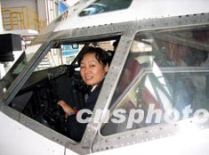 中國海南航空公司第一位女機長丁華榮駕駛飛機準備升空。作者:黃葵