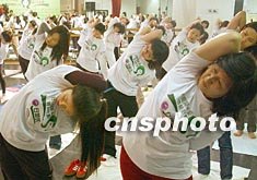 “白蘭氏”與香港各界婦女聯(lián)合協(xié)會(huì),三月八日在香港舉行“百人紓壓瑜伽日”活動(dòng)。圖為眾多女士練瑜伽功。錢興強(qiáng) 攝