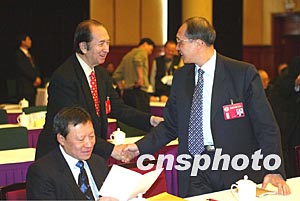 正在北京出席全國政協(xié)十屆一次會議的何鴻燊與鄒哲開在港澳政協(xié)委員聯(lián)組會上互致問候。作者:毛建軍