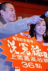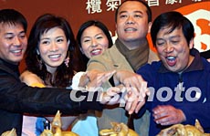 無(wú)線電視藝員歐陽(yáng)震華、佘詩(shī)曼、歐錦堂、滕麗名及劇目監(jiān)制蕭顯輝等演員,3月9日在慶祝該劇目收視率取得佳績(jī)時(shí)與觀眾玩游戲。洪少葵 攝