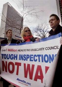 這份包括60萬美國人的簽名請?jiān)笗粲趼?lián)合國安理會(huì)繼續(xù)對(duì)伊拉克進(jìn)行武器核查以避免戰(zhàn)爭。名叫“蠃得勝利,不用戰(zhàn)爭”的聯(lián)合會(huì)表示,他們希望通過這些安理會(huì)常任理事國代表向各自國家政府傳遞這樣一個(gè)信息:薩達(dá)姆·侯賽因可以在避免戰(zhàn)爭的情況下被監(jiān)督。他們這么做,旨在為聯(lián)合國核查人員爭取必要的時(shí)間以完成自己的職責(zé),而并不是請求什么不可實(shí)現(xiàn)的東西。