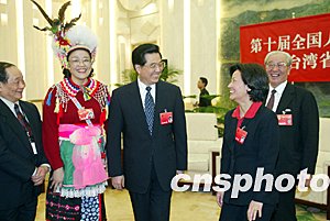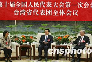 胡錦濤向臺(tái)灣代表團(tuán)的各位代表,并向廣大臺(tái)灣同胞致以誠(chéng)摯的問候。會(huì)場(chǎng)上,發(fā)言踴躍,親情融融。胡錦濤認(rèn)真聽取大家的發(fā)言。他說,中共十三屆四中全會(huì)以來,我們堅(jiān)持“和平統(tǒng)一、一國(guó)兩制”的基本方針,應(yīng)對(duì)挑戰(zhàn),排除干擾,大力推動(dòng)對(duì)臺(tái)工作,取得了重大成果。國(guó)際社會(huì)普遍堅(jiān)持承認(rèn)一個(gè)中國(guó)的基本立場(chǎng),兩岸關(guān)系的基本格局和發(fā)展趨勢(shì)沒有改變。這是以江澤民為核心的第三代中央領(lǐng)導(dǎo)集體正確決策和堅(jiān)強(qiáng)領(lǐng)導(dǎo)的結(jié)果,是包括臺(tái)灣同胞在內(nèi)的全體中華兒女共同努力的結(jié)果。