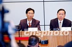 香港入境事務(wù)處處長(zhǎng)黎棟國(guó)(右)與財(cái)經(jīng)事務(wù)及庫(kù)務(wù)局首席助理秘書長(zhǎng)劉應(yīng)彬,3月11日在記者會(huì)上,就資本投資者入境計(jì)劃及輸入內(nèi)地人才計(jì)劃答記者問。洪少葵 攝