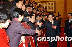 河北華龍集團董事長范現(xiàn)國發(fā)言時,剛叫了一聲“首長”,黃菊馬上說:“大家是一起審議的,不要叫首長,叫黃菊同志就行了!