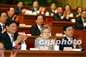 十屆全國人大一次會議十七日舉行第七次全體會議,表決全國人大各專門委員會組成人員,決定國務(wù)院副總理、國務(wù)委員、各部部長、各委員會主任、中國人民銀行行長、審計長、秘書長人選。吳儀(中)出任國務(wù)院副總理。作者:毛建軍