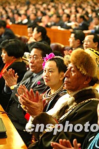 十屆全國人大一次會議十七日舉行第七次全體會議,表決全國人大各專門委員會組成人員,決定國務(wù)院副總理、國務(wù)委員、各部部長、各委員會主任、中國人民銀行行長、審計長、秘書長人選。圖為代表鼓掌祝賀新一屆政府組成。作者:毛建軍
