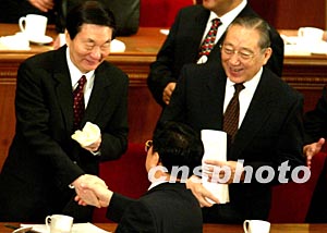 十屆全國(guó)人大一次會(huì)議十八日在北京閉幕,朱镕基、李嵐清握手和老友告別。作者:鄭萍萍