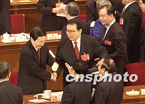 朱镕基三月十八日參加十屆全國(guó)人大一次會(huì)議閉幕會(huì)后,與李長(zhǎng)春等代表握手致意。作者:盛佳鵬