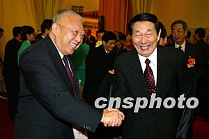 十屆人大一次會(huì)議十八日上午在北京人民大會(huì)堂閉幕,出席會(huì)議的香港特別行政區(qū)行政長(zhǎng)官董建華與前總理朱镕基話(huà)別。作者:毛建軍