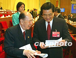 十屆人大一次會議十八日上午在北京人民大會堂閉幕,參加閉幕會的馬萬祺請胡錦濤主席看他的新詩作。作者:毛建軍