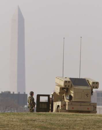 中新網(wǎng)3月19日電 由于美伊戰(zhàn)爭一觸即發(fā),美國政府對其本土也加強(qiáng)了防御,以對付可能發(fā)生的恐怖襲擊。圖為當(dāng)?shù)貢r間3月18日,美軍在華盛頓的一個山坡上部署“復(fù)仇者”地對空導(dǎo)彈,遠(yuǎn)處的華盛頓紀(jì)念碑依稀可見。(固山)