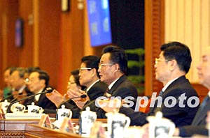 十屆全國人大常委會一次會議十九日在北京舉行,全國人大常委會委員長吳邦國及新當(dāng)選的副委員長們出席。作者:滿會喬