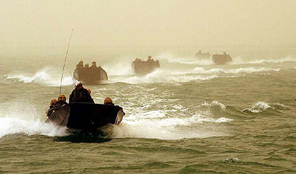 英國(guó)海軍陸戰(zhàn)隊(duì)突擊兵和美國(guó)海軍陸戰(zhàn)隊(duì)員們想重演二戰(zhàn)時(shí)西西里島登陸戰(zhàn)的場(chǎng)面,可伊拉克軍隊(duì)卻不配合:當(dāng)?shù)貢r(shí)間20日晚,科威特北部的美英重炮部隊(duì)、阿拉伯灣北部水域的海軍艦炮、巡航導(dǎo)彈和美國(guó)航母起飛的艦載機(jī)同時(shí)對(duì)伊拉克第二大城市巴士拉的戰(zhàn)略門(mén)戶――法奧半島進(jìn)行了煞有介事的狂轟濫炸。