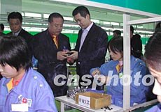 泰國(guó)華人青年商會(huì)潮汕地區(qū)經(jīng)濟(jì)文化訪(fǎng)問(wèn)團(tuán)三月二十八日在廣東汕頭參觀奧迪玩具實(shí)業(yè)有限公司。該公司總經(jīng)理蔡?hào)|青(后左三)向訪(fǎng)問(wèn)團(tuán)團(tuán)長(zhǎng)李桂雄(后左二)介紹情況。作者:王惠存