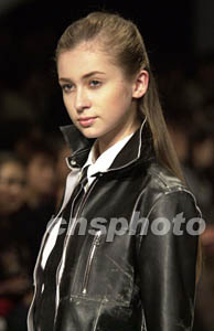 在二00三年東京秋冬時(shí)裝展上,日本各路時(shí)裝設(shè)計(jì)師順次登場發(fā)表新作。圖為模特28日晚演示著名時(shí)裝設(shè)計(jì)師鳥居由紀(jì)的皮革新作。作者:陶光雄