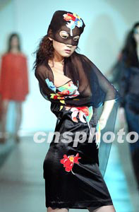 三月二十八日晚,“愛美”時裝在北京昆侖飯店舉行春夏時裝流行趨勢發(fā)布會,一名戴面具的模特展示一款性感時裝。作者:盛佳鵬